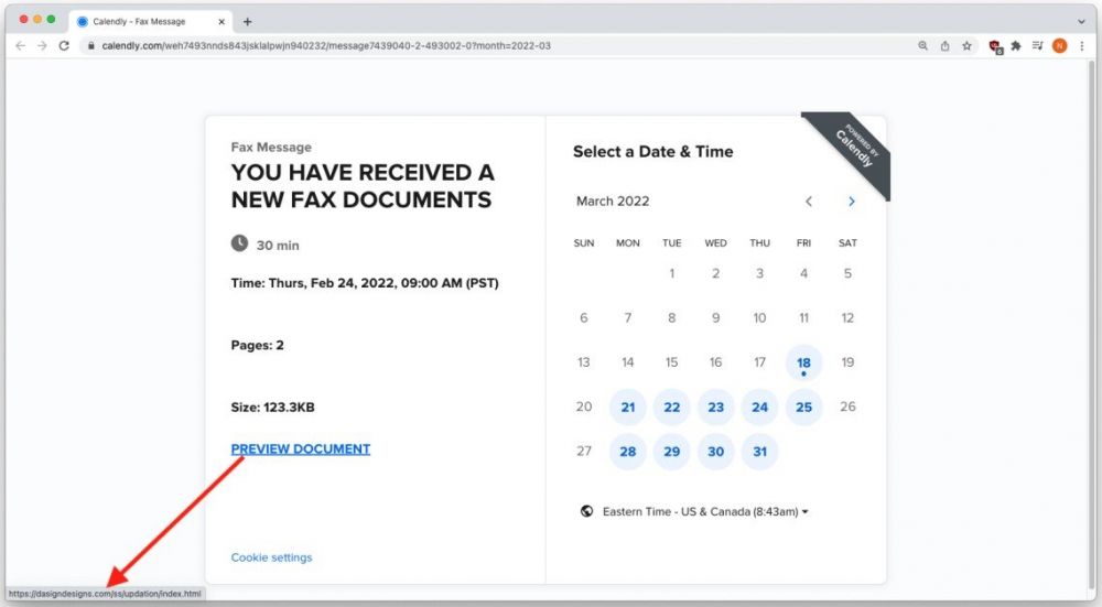 网络钓鱼攻击始于 Calendly 平台上生成的网络钓鱼电子邮件,通知收件人他们收到了新的传真文档。
