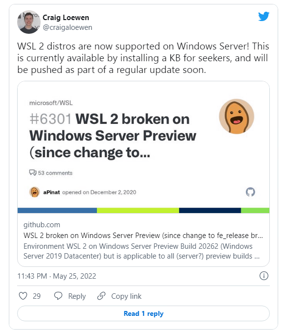 “大家好,我们已经在 Windows Server 2022 上添加了对 WSL 2 发行版的支持!现在可以通过安装 KB5014021 获得,”Loewen 说。