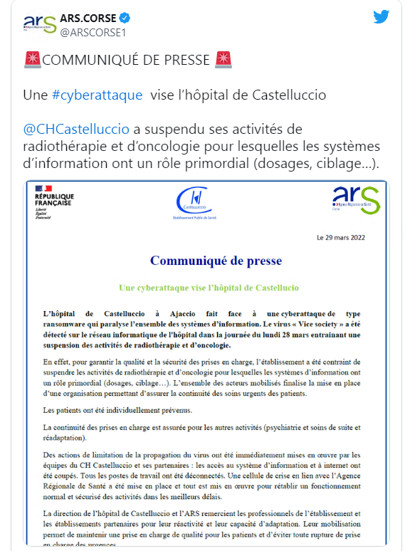 3 月底,科西嘉岛的卡斯特鲁西奥医院遭到黑客袭击,黑客还设法在攻击期间泄露了敏感的患者数据和其他文件。