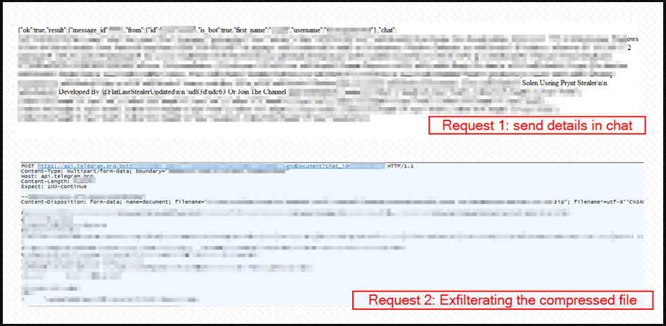 压缩数据的最终盗窃是通过 Telegram 机器人完成的,该机器人使用安全的加密网络连接将所有内容传递到远程服务器。