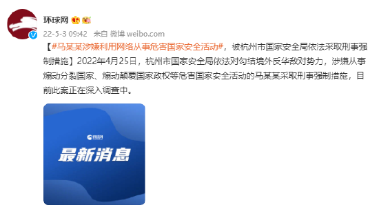 2022年4月25日,杭州市国家安全局依法对勾结境外反华敌对势力,涉嫌从事煽动分裂国家、煽动颠覆国家政权等危害国家安全活动的马某某采取刑事强制措施,目前此案正在深入调查中。